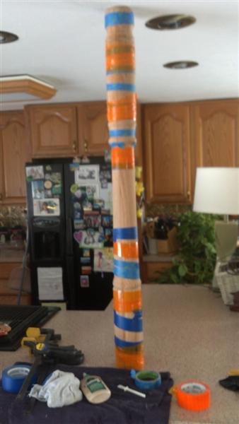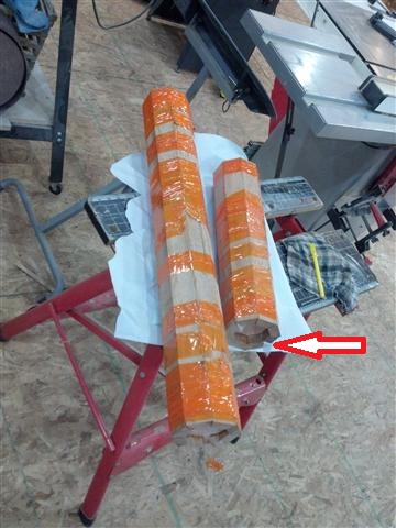 I will be splitting the cover into two pieces to install around existing pole. I put a sheet of paper between the stave sections where I want to take the turned pieces apart. (arrow above)