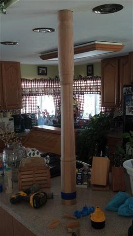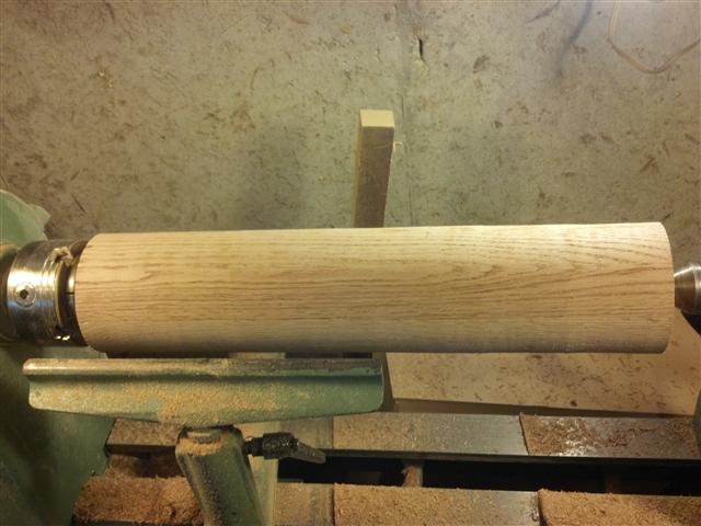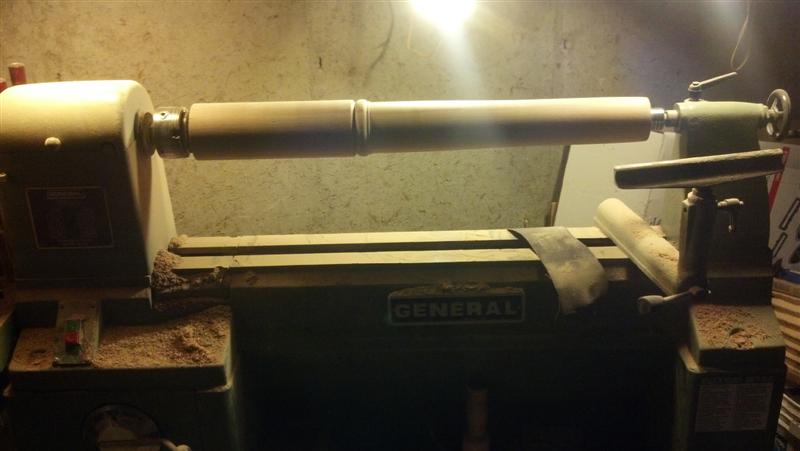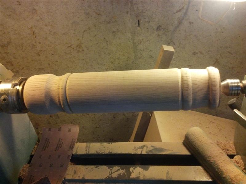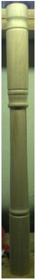 Next I using the stairway newel post as a guide I turned the details. I made a socket on the right for the base to slip into.