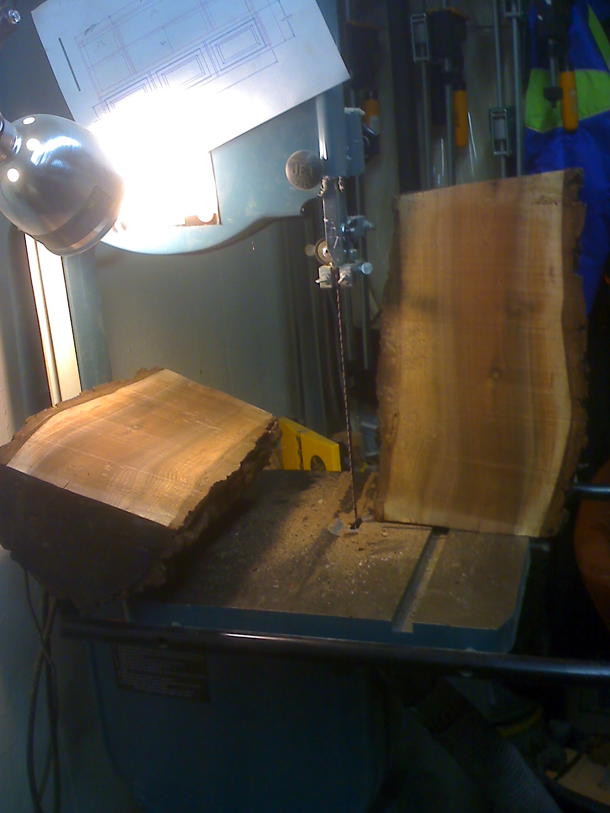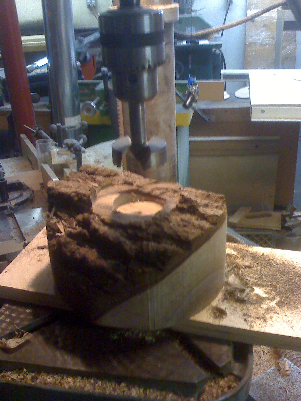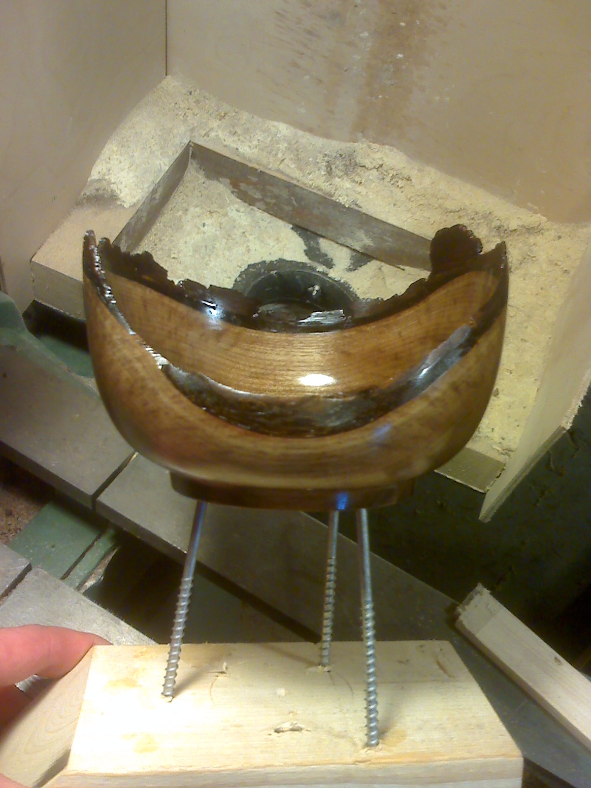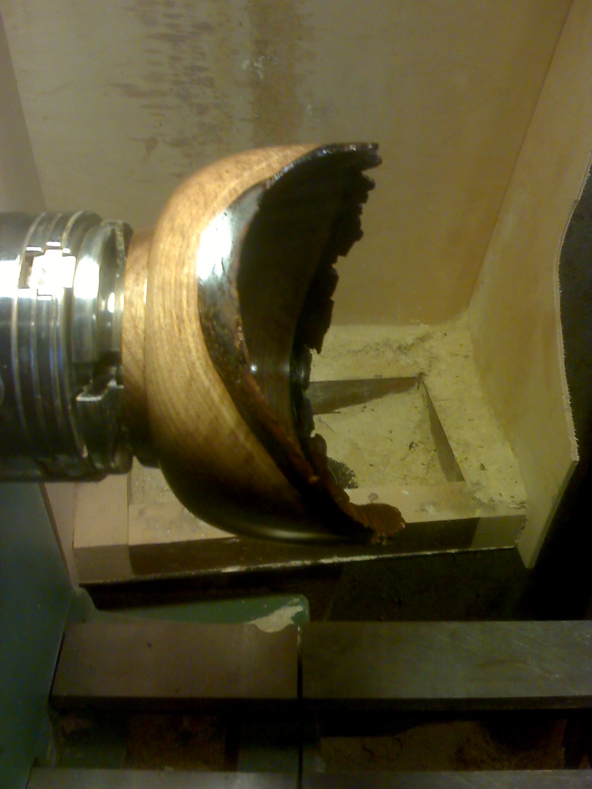 The inside is removed until about 3/16" wall is left it is then dried then re-mounted and sanded.