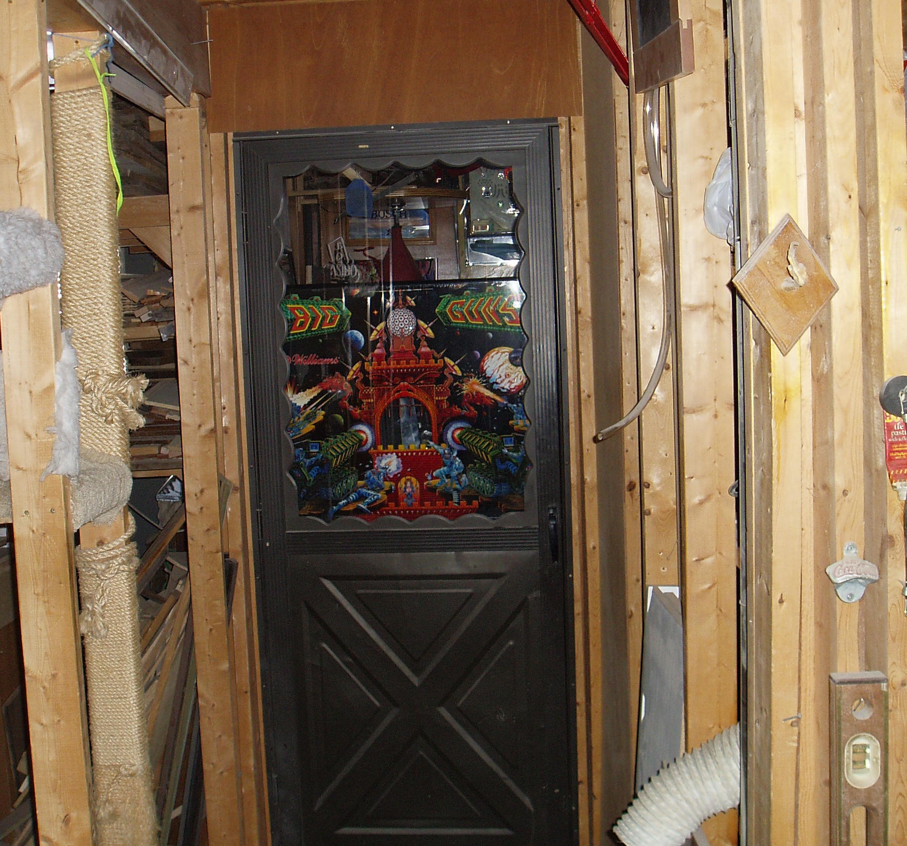 Game room door, with Big Guns translite in the window.